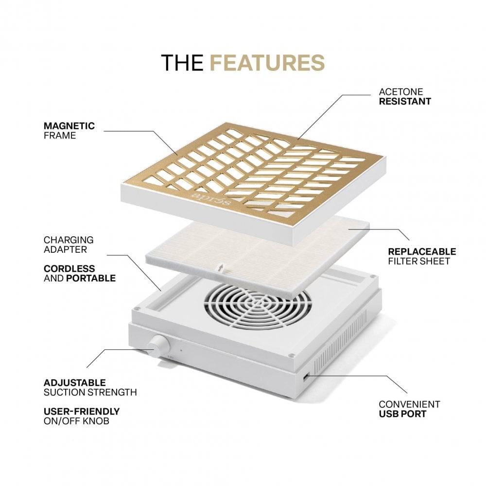 The rechargeable and cordless design make it easy to move between manicure ad pedicure stations while the acetone-resistant coating and USB charging port provide additional convenience. For the busy nail professional, the Aprés Dust Collector is the ultimate tool for maintaining a clean and professional workspace.