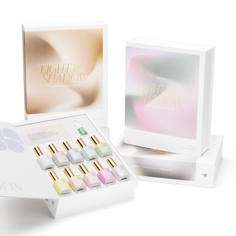 After prepping the natural nail and applying the Base Gel coat, apply a layer of Light & Shadow Sheer Gel Couleur then cure for 30 sec LED. Follow with an optional second coat for a more opaque finish, curing for 30 sec LED. Finish with the Après Non-Wipe Top Gelcoat. When applying on Gel-X Tips, NO base coat is needed.