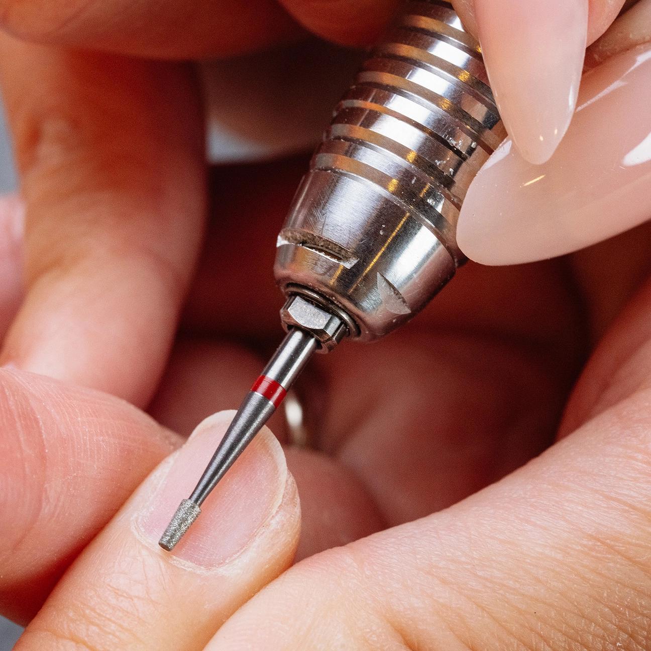 Select the right bit for the service. Using a coarse bit on a natural nail may thin or damage the nail plate. Always choose finer grit bits for gentle prep work or natural nail services.