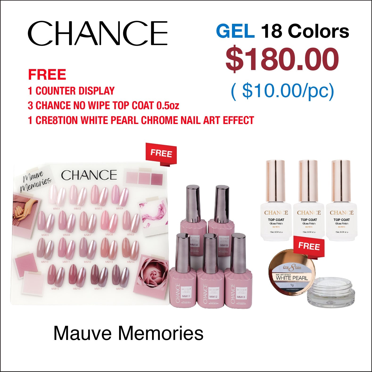 Chance Mauve Memories Collection 0.5oz - 18 Colors w/ 1 Counter Display, 3 Chance No Wipe Top Coat 0.5oz & 1 Cre8tion White Pearl Chrome