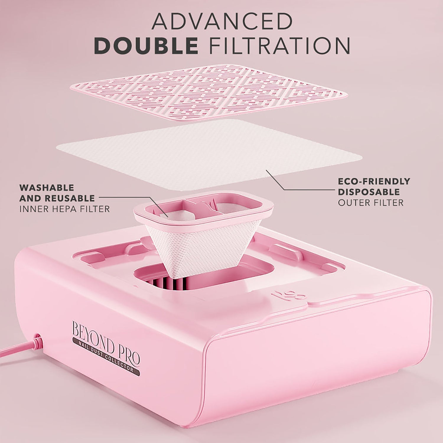 This Dust Collector also features an Advanced Double Filtration System, a groundbreaking innovation that effortlessly captures the finest dust particles using two filters, a washable and reusable HEPA Certified Inner Filter plus a Disposable Outer Filter, providing each client with a clean, professional experience without the hassle of frequent cleaning or added costs!